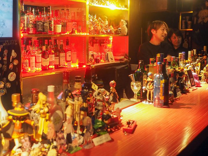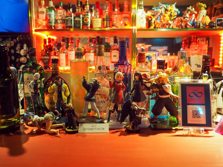No specific anime genre is shown, and the selections often change with the mood. For guests’ amusement, an assortment of figurines adorn the counter, but it’s the top shelf above the whiskey that’s reserved for the showpiece figures.