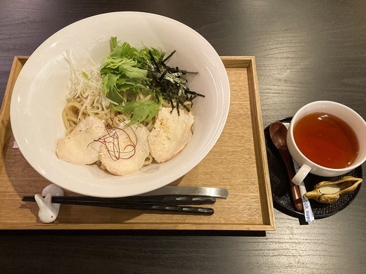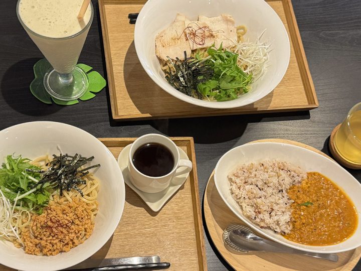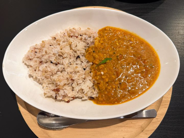 The lunch set menu currently offers Mazesoba or vegan spice curry. The Mazesoba is either plant-based or with chicken. The chicken version has three flavors: soy sauce koji, tomato koji, or salt koji. The vegan Mazesoba is in soy sauce koji with minced soy meat and sesame oil. You can choose the size of your noodle serving from small (890 yen) to extra large (1,090 yen). Mazesoba means “mixed noodles”, served without broth. Make sure to mix them well and enjoy them as is at first, then try adding some vinegar and chili oil for “ajihen”, which means adding condiments midway through eating a single dish to create a new taste experience. It’s so umami-rich with the magic of koji! The vegan curry, served with rice, is made with minced soy meat, coconut milk and exquisite spices that are full of flavor without being too hot.